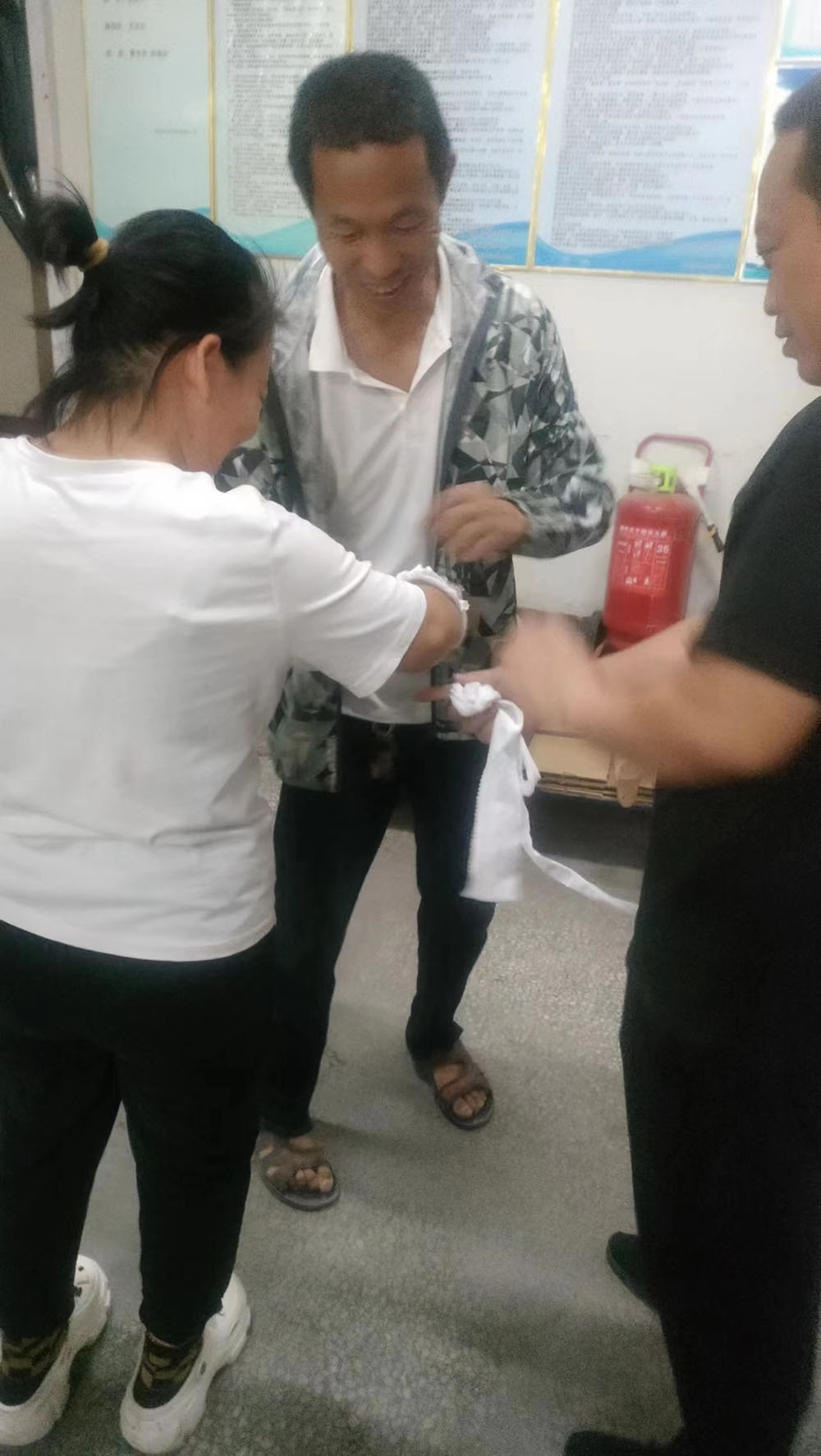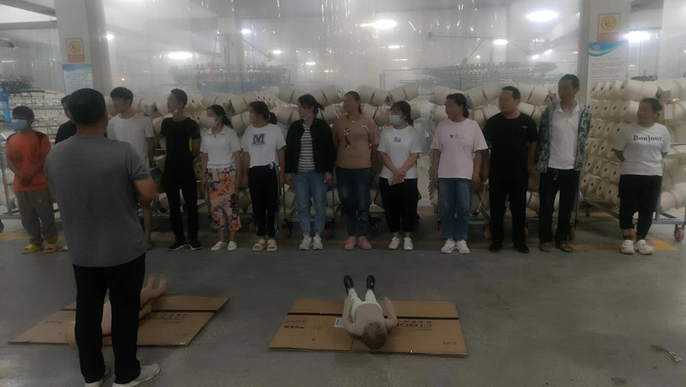首先,模擬車間生產(chǎn)現(xiàn)場(chǎng)出現(xiàn)機(jī)械傷害事故,有員工被卷入大圓機(jī)中受傷,馬上啟動(dòng)應(yīng)急預(yù)案。各應(yīng)急小組緊張地投入到應(yīng)急救援工作之中,搶救傷員、救護(hù)包扎、緊急聯(lián)絡(luò),各項(xiàng)工作有序展開。救援小組立即關(guān)停機(jī)器,將受傷員工從機(jī)器中搶救出來。救護(hù)小組給傷員檢查傷情,包扎止血。聯(lián)絡(luò)小組打120請(qǐng)求派救護(hù)車緊急救護(hù),受傷員工得到了及時(shí)救治。